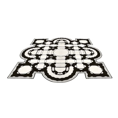 Pietro es una alfombra fabricada en un 80% de lana y un 20% de poliamida impresa en blanco y negro con el borde al ras. La clara inspiración está en la planta de la famosa Basílica de San Pedro, una iglesia del Renacimiento tardío situada en la Ciudad del Vaticano. Disponible en dos tamaños.