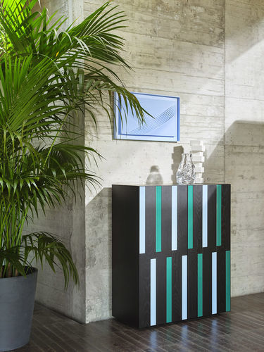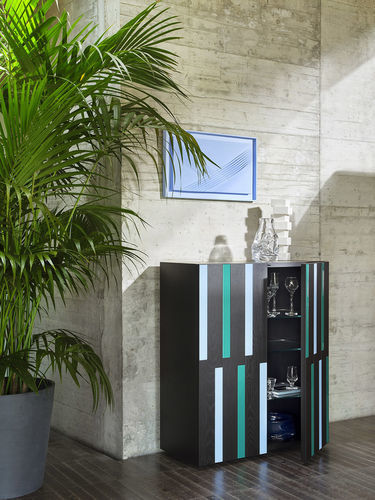 Estructura en MDF chapada en fresno lacado a poro abierto en color negro o granate. Inserciones en cristal pintadas por detrás en color menta y cielo, para la versión negra, o marfil y coral, para la versión granate. Estantes interiores regulables en cristal templado extraclaro. Sobre pedido, es posible integrar una fuente de luz LED neutra en el interior de l’aparador.