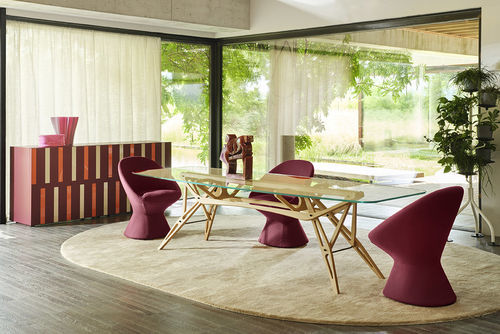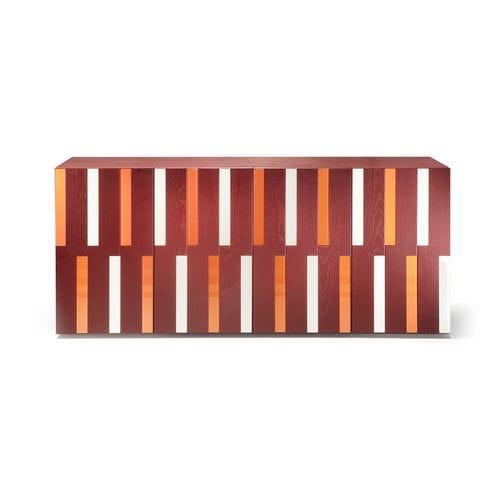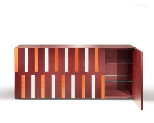 Estructura en MDF chapada en fresno lacado a poro abierto en color negro o granate. Inserciones en cristal pintadas por detrás en color menta y cielo, para la versión negra, o marfil y coral, para la versión granate. Estantes interiores regulables en cristal templado extraclaro. Sobre pedido, es posible integrar una fuente de luz LED neutra en el interior del mueble.