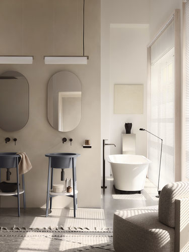 In this image, bathroom furnished with the new I Catini collcetion by Ceramica CIELOm designed by Andrea Parisio and Giuseppe Pezzano. On the left, two Catino Tondo washbasins in the Cemento finish with metal structure also in the Cemento finish and the countertop in White Carrara marble. On the left the freestanding bathtub in Solid Surface Ottavia in a Matt White finish and metal structure in Matt Black. Two Oval mirrors with Cemento frames complete the composition.