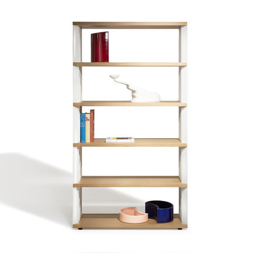 Estructura en acero pintado brillante, color talco, caramelo, naranja, granate, alga. Estantes en MDF chapados en roble barnizado natural. Las bibliotecas en versión alta, si se colocan una al lado de la otra, pueden unirse mediante una pieza de union en dotacion.