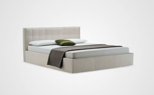 Base y cabezal acolchados de poliuretano/fibra poliester termounida. Tapizado pespunteado desenfundable de tejido o de piel. La cama en el modelo 1874 està provista de una base contenedora a la cual se accede alzando el colchón por medio de un mecanismo al efecto. Sobre pedido, solo por el modelo 1875 podemos suministrar la cama con los soportes angulares regulables para poder poner el somier a alturas diferentes y en la medida para el colchón de 210 cm de largo.