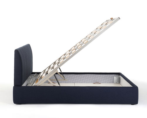 Estructura somier de acero pintado color aluminio. Suspension con lamas de haya curvadas, de color natural. Cabezal acolchado de espuma de poliuretano autoextintivo/ fibra poliéster termounida. Tapizado desenfundable de tejido o de piel. La cama está provista de una base contenedora a la cual se accede alzando el somier por medio de un mecanismo.
