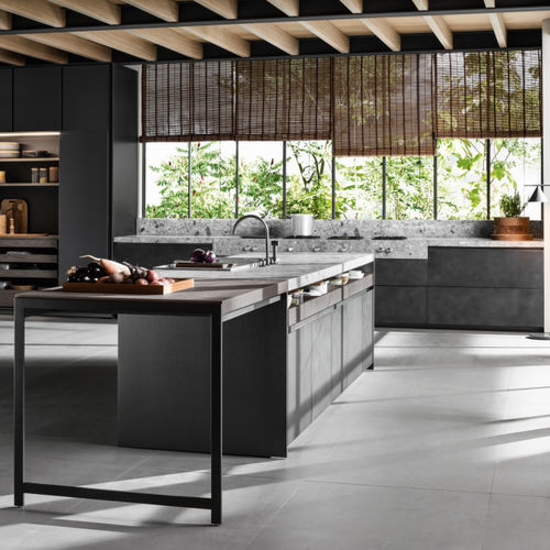 Vincent Van Duysen interpreta la cocina sin tirador, trabajando el contraste entre los delgados espesores de los laterales y los terminales, y los espesores importantes de las superficies de trabajo, que se incorporan, interrumpiendo la linearidad de la superficie, con fregaderos apoyados en piedra. La alternancia de materiales y el juego de llenos y vacíos plasman una cocina dinámica y al mismo tiempo sofisticada.