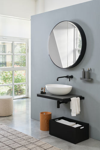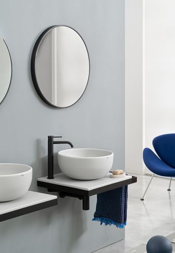 Sistema compatible con instalación suspendida, en varias medidas y compuesto de una encimera en cerámica, disponible en varios acabados, montado en una estructura de acero barnizad, con la posibilidad de añadir toallero como complemento