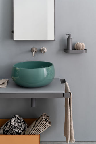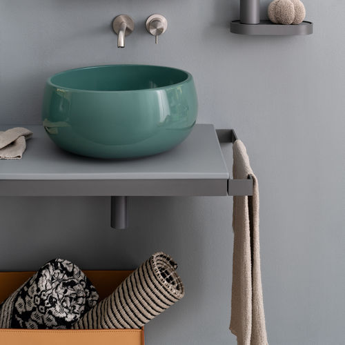Sistema compatible con instalación suspendida, en varias medidas y compuesto de una encimera en cerámica, disponible en varios acabados, montado en una estructura de acero barnizad, con la posibilidad de añadir toallero como complemento