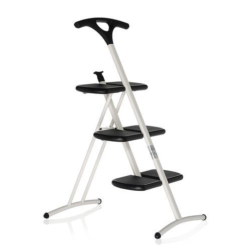 Una escalera plegable funcional de tres escalones con tratamiento antideslizante. En Tiramisù destaca la ligereza del diseño de la estructura portante: las barras curvadas proporcionan el apoyo en el suelo mientras que la manilla no sólo es un robusto elemento de apoyo durante el uso, si no también un práctico instrumento funcional una vez terminada la utilización; de hecho gracias a su particular diseño Tiramisù se puede colgar en la pared.