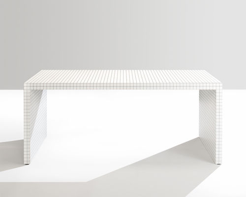Estructura de madera enchapada aplacada con laminado Print, color blanco, a impresion digital en cuadritos negros de 3 cm.