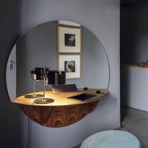 Espejo que se convierte en consola gracias a la tapa abatible, elemento funcional en la zona de entrada, discreto e íntimo en la zona de descanso. Con un diseño minimalista, adornado por la elegante combinación de los acabados propuestos.