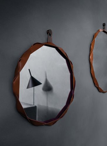 Cristal espesor 5 mm. El borde del espejo es en cuero trenzado en color gold acoplado con Alcantara® en los colores gold, azul y morado. Para colgar el espejo a la pared está prevista una placa en metal bronceado.