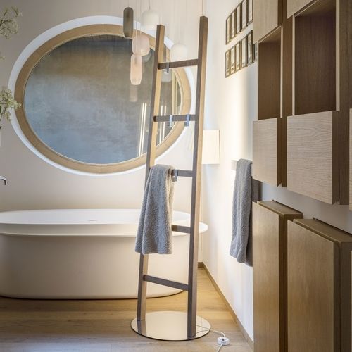 Alla Scala es un colgador de lámparas en madera de fresno maciza. Está disponible de forma independiente gracias a la placa metálica lastrada o para ser colocada en la pared. Funcional y con un diseño sencillo se adapta a cualquier tipo de ambiente. Dispone de algunos accesorios como perchas, estantes y un espejo.
