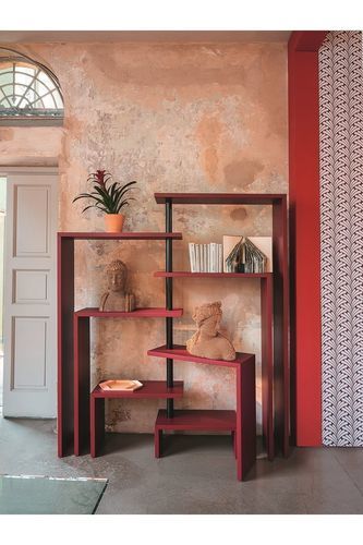 Estantes de MDF lacado en relieve anti-rasguño en los colores talco, cañamo, granate, espresso o negro. Articulación de acero pintado negro por las versiones en cañamo, granate, espresso, negro o talco por la versión en talco. El mueble está disponible con cinco o siete estantes.
