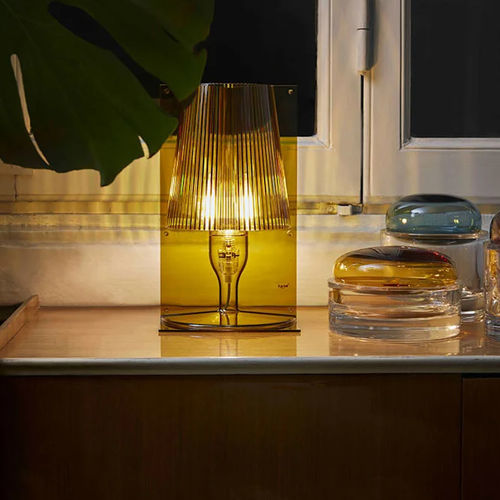 La lámpara de noche clásica y emblemática renovada gracias a la tecnología Kartell para transformarse en un producto industrial en diversas tonalidades cromáticas. La forma de Take nace de la conjunción de dos partes simétricas: dos láminas planas y rectangulares que pasan de ser bidimensionales cuando en el centro asumen la forma y el volumen de la “semilámpara”. El plisado interior de la pantalla embellece el objeto, creando un juego de reflejos cuando está encendida.
