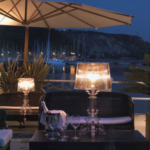 Bourgie conjuga estilo clásico, riqueza y tradición con innovación e ironía. La base, de estilo barroco, está constituida por tres patas decoradas que se cruzan, mientras que la amplia pantalla con efecto plisado crea un juego de mil reflejos cuando se enciende. Gracias al particular sistema de enganche de la pantalla se pueden obtener tres alturas diferentes, que se pueden modificar como se desee en función del uso que se le vaya a dar: 68, 73 y 78 centímetros.