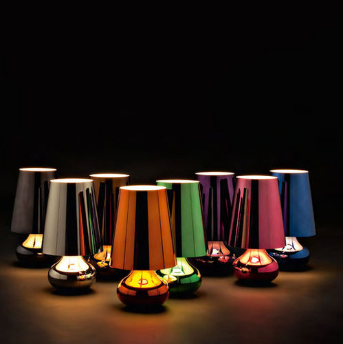 La típica lámpara de mesa de los a–os setenta, revisada en cuanto a la forma y los colores. La lámpara Cindy, que se compone de una pantalla cónica y una base esférica, que baja en forma de gota, se propone en una amplia gama de tonalidades metalizadas op