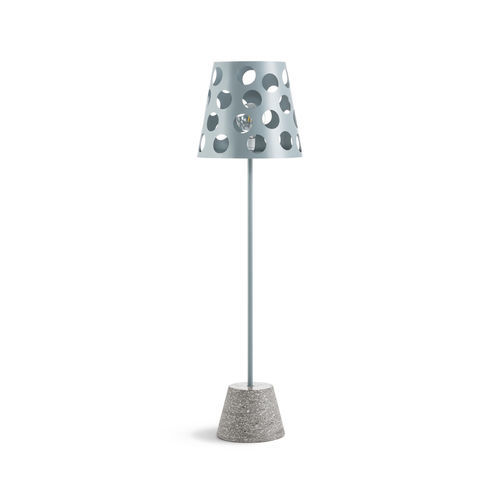 Lámpara de pie de luz directa. La lámpara está hecha con una base de cemento, una columna de metal y una pantalla. La lámpara está disponible en una amplia gama de colores metálicos. En el cable de alimentación eléctrica se encuentra el interruptor de encendido/apagado. El cable tiene una longitud de 2 m y está cubierto de seda negra.