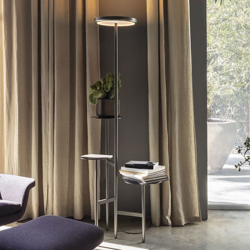 Lámpara de pie de metal que combina luz y lugares de apoyo de forma elegante y contemporánea. Objetos o plantas pueden convertirse en los protagonistas de este elemento con un diseño limpio y lineal donde, junto a su función iluminadora, se renueva siempre, convirtiéndose en una «pieza única» cada vez.