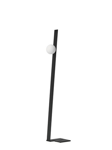 Lámpara de pie con luz difusa directa. El difusor es de cristal satinado y es regulable en altura a lo largo de la barra de soporte. La estructura es de metal en la única variante de color negro. La luz blanca y opalina recorre la banda en un ejercicio de formas atemporales.