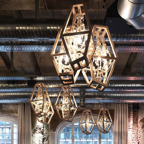 Crystal es una lámpara de suspensión o de pie de cristal con estructura de madera. Esta lámpara reproduce el estilo de María Teresa. La versatilidad es la consigna de este proyecto: una lámpara inspirada en las antiguas y elegantes arañas, pero con un enfoque moderno, que la hace más práctica e innovadora.