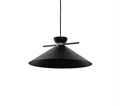El cable de suspensión eléctrico está cubierto de seda negra con una longitud de 2,5 m. Rosetón metálico negro o blanco. Disponible kit de descentralización del dosel y dosel múltiple para crear composiciones de hasta seis sospensiones.