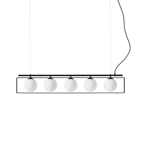 Lámpara de luz difusa y directa. Las esferas que componen el difusor son de vidrio soplado. Cinco esferas de vidrio satinado se deslizan dentro de un rectángulo negro, en un ejercicio de formas atemporales.