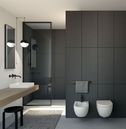 Lavabo semiempotrado, sin rebosadero, disponible en varios acabados cerámicos.