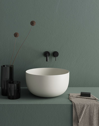 Lavabo Era redondo terminado en todos los lados. Disponible en varios acabados cerámicos.