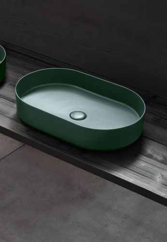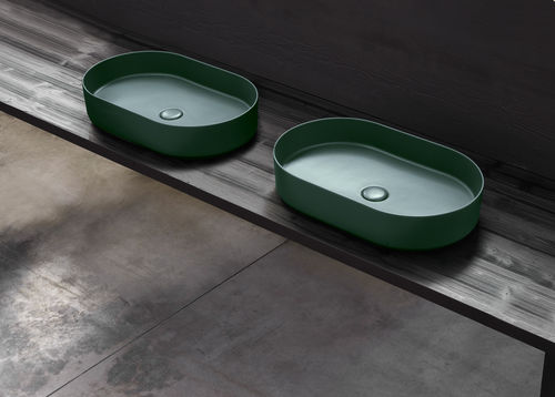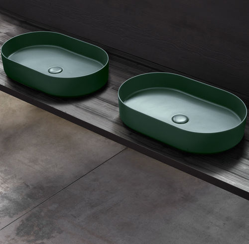 Lavabo de apoyo sin rebosadero, refinido en todos los lados. Disponible en varios acabados cerámicos.