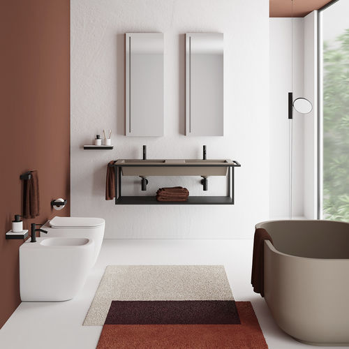 Lavabo sin rebosadero, para instalación suspendido o de apoyo, disponible en varios acabados cerámicos.