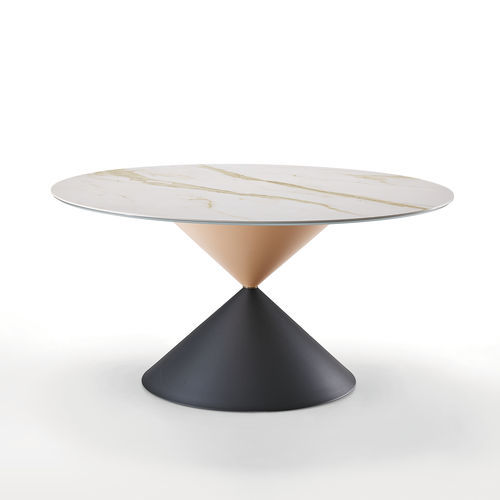 Mesa redonda fija con base metálica maciza o bicolor. Disponible la versión de madera. Tablero de cristalcerámica, mármol o madera.