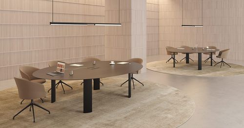 La mesa de diseño Fuste incluye una altura especial de 65cm, pensada para butacas y su tablero está disponible en dos medidas, 210x160cm y 260x180cm y cinco acabados.