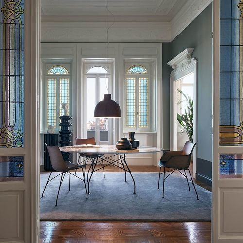 Es una familia de mesas perfectas para el hogar y la oficina. La estructura ligera de acero es particular porque se utiliza un elemento en forma de cruz que une las patas de los cuatro lados y sujeta el tablero. La colección incluye mesas cuadradas, ovaladas y redondas.