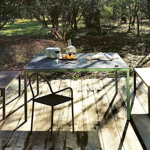 Gama de mesas con bastidor de acero desmontable, sección mm 35×35, y juntas de aluminio fundido a presión. Encimeras de laminado o cerámica. Bancos con estructura de acero desmontable (sección mm 35×35), y juntas de aluminio fundido a presión. Encimeras de laminado estratificado.