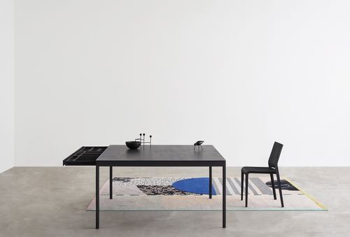 Mesas, mesitas y consolas con estructura de acero y cajones, tableros de cristal templado de 8 mm o cerámica de 6 mm. Cajones con guías de bolas de extracción total. Accesorios de almacenamiento en los cajones de neopreno negro lavable (opcional).