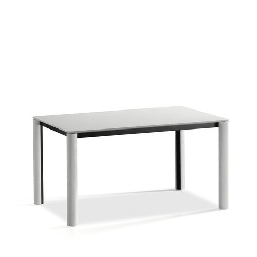 Mesa fija Woody con base de cuatro patas en madera de fresno teñida con núcleo de metal lacado. Estructura metálica. Tablero en madera chapada, fenix, laminado, cristal cerámico o vidrio.