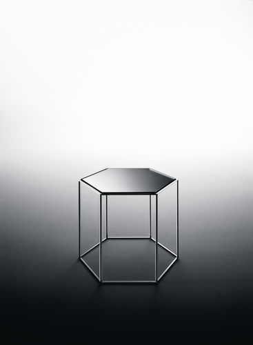 Mesa pequeña con estructura de acero desmontable, marco de forma hexagonal, tablero de cristal biselado. Disponible también en versión nido con tablero de cristal biselado o de chapa.