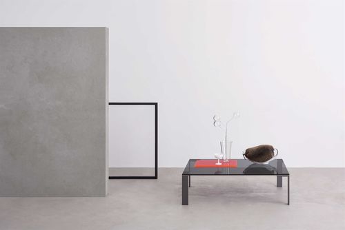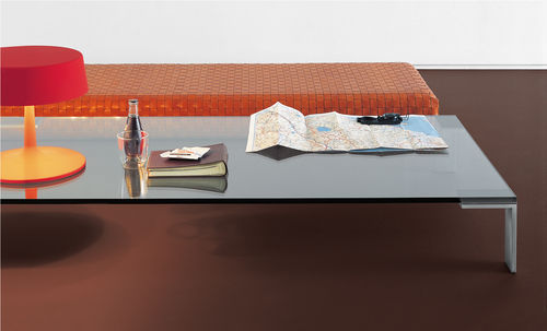 Mesa pequeña desmontable con tapa de cristal templado y patas de acero.
