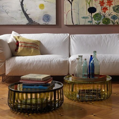 Panier es un cesto de formas simples que puede cerrarse con una tapa y transformarse en una pequeña mesita para café o un revistero.