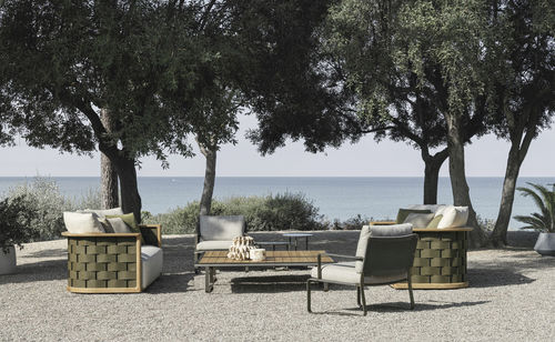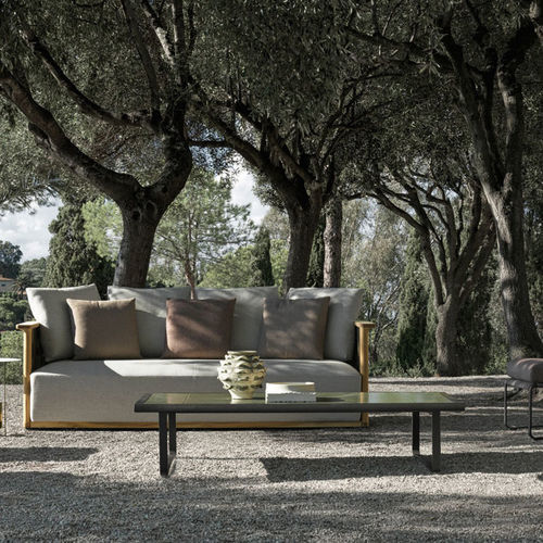 La Colección Timeout se completa con una gran mesa baja de dos anchos, para espacios de exterior versátiles, íntimos o de convivencia. Recoge los motivos estéticos de la colección, como la banda de aluminio bruñido, los perfiles y las esquinas redondeadas. Las bases de apoyo, obtenidas a partir del recorrido continuo de la misma banda, se retranquean de la parte superior para aligerarla visualmente, como si estuviera suspendida.