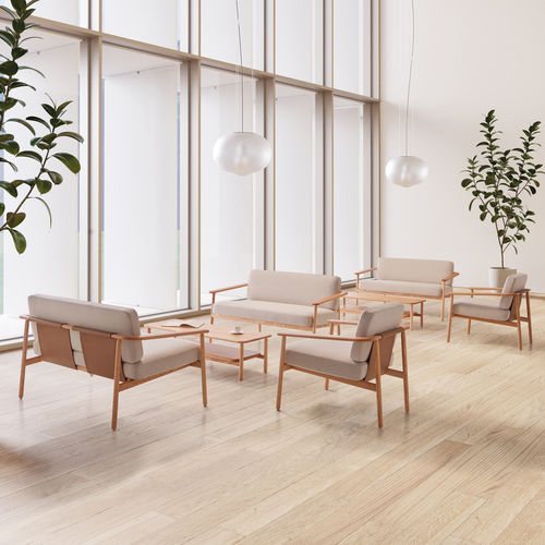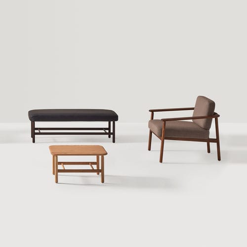 WUDI es una colección de butacas, bancos y mesas auxiliares para zonas lounge que combinan tradición y modernidad a través del uso de la madera. La butaca es un diseño elegante, atemporal y cómodo, caracterizado por unos brazos expresivos. Un respaldo que se apoya sobre un tejido tensado a modo de vela contribuye al espíritu ligero y relajado de la pieza. La estructura redondeada de madera maciza irradia calidez y suaviza su imagen, mientras que el tapizado y los detalles de alta calidad le confieren una gran elegancia. La colección se completa con originales bancos tapizados y mesas auxiliares que se integran con facilidad en múltiples espacios.