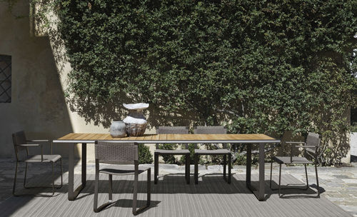 La mesa de comedor de la Colección Timeout interpreta el arquetipo de las mesas de exterior con un tablero de listones para el drenaje del agua. Con capacidad para 6 u 8 personas, destaca por sus proporciones cuidadosamente calibradas y la elección de materiales que le permiten combinar con las dos nuevas colecciones de exterior de Molteni&C.