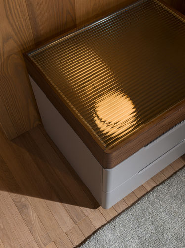 Rodolfo Dordoni ha diseñado un conjunto completo, en el que los materiales y acabados nobles se combinan con un diseño sobrio y elegante para lograr nuevas soluciones estéticas funcionales. Ambos muebles, la mesita de noche y los cajones, presentan un frente con esquinas redondeadas que aligera la estructura. Los tres cajones de la cómoda y los dos de las mesitas de noche están lacados en los colores de la gama Molteni&C y cuentan con finos tiradores de peltre empotrados y de fácil agarre. Una novedad es la bandeja-cajón superpuesta, también de madera de eucalipto, con tapa de cristal acanalado transparente. Como alternativa, la mesita de noche y la cómoda pueden enriquecerse con una delgada tapa de eucalipto.