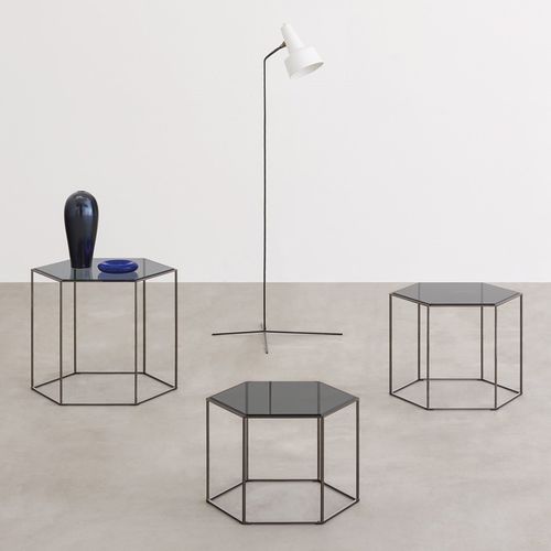 Colección de mesas pequeñas, inspiradas en el panal de abejas. Formas puras y rigurosas a las que se añaden detalles ejecutados con minuciosa precisión. Las distintas dimensiones y alturas permiten combinaciones y superposiciones para responder a las más diversas exigencias de uso. Las mesitas hexagonales adquieren diferentes caracteres al variar los acabados.