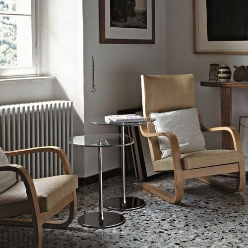 Mesa pequeña con tubo y base de acero lacado o con los exclusivos acabados de Desalto. Tablero de cristal templado mm 10.