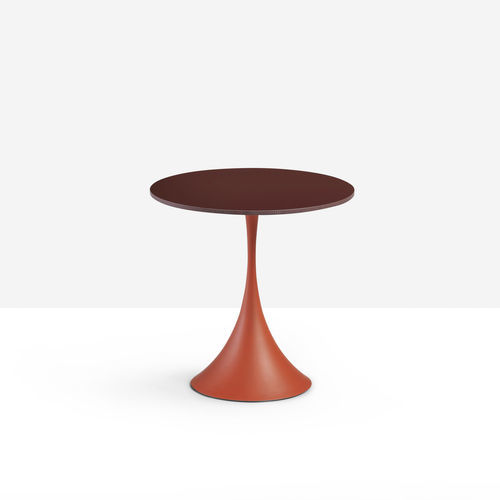 Mesa de centro Leo con base de metal y tapa redonda disponible en diferentes acabados como HPL, chapa de madera, cerámica y mármol.