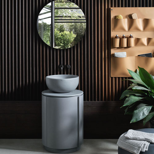 Práctico mueble contenedor freestanding, con dos estantes internos, disponible tanto en centro habitación con desagüe a suelo, como en la versión con desagüe a pared. El mueble se puede hacer en acabados lacados o en prestigiosas esencias naturales, combinado con una placa de cerámica y un lavabo, ambos en múltiples acabados.