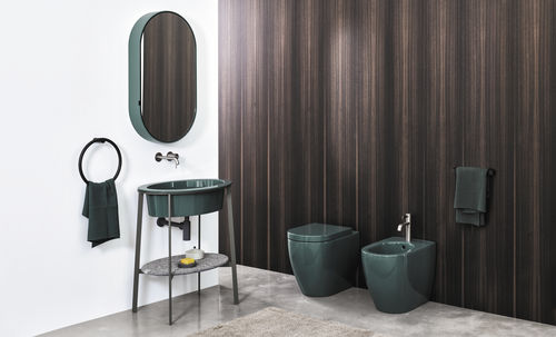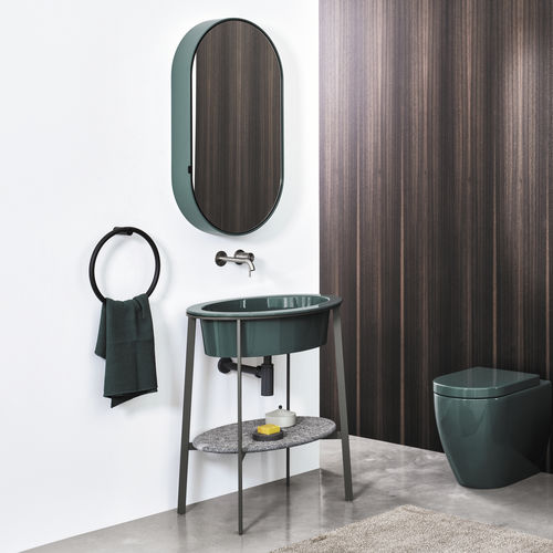 Sistema modular con lavabo de cerámica de múltiples acabados, disponible en dos versiones con o sin orificio para grifo, montado sobre una estructura de acero pintado en diferentes acabados y la posibilidad de combinar una cómoda encimera de cerámica o mármol o un práctico cajón contenedor disponible en acabados lacados o en preciosas esencias naturales.