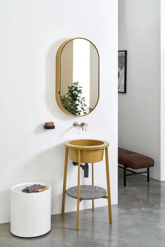 Los Catinos: El redondo, el ovalado, el doble y el rectangular, cuatro diversas interpretaciones de un único objeto, que integran armoniosamente estructuras de acero, lavabos y encimeras en cerámica,o encimeras en mármol, o un cómodo cajón contenedor. Completan la colección dos espejos contenedores Tondo y Ovale y una serie de las líneas esenciales de toalleros y porta objetos.