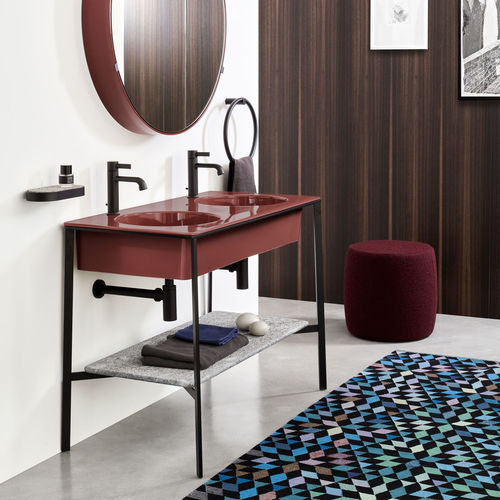 Los Catinos: El redondo, el ovalado, el doble y el rectangular, cuatro diversas interpretaciones de un único objeto, que integran armoniosamente estructuras de acero, lavabos y encimeras en cerámica,o encimeras en mármol, o un cómodo cajón contenedor. Completan la colección dos espejos contenedores Tondo y Ovale y una serie de las líneas esenciales de toalleros y porta objetos.