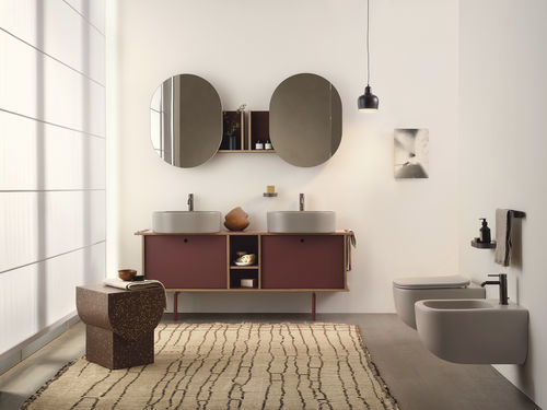 Lavabo de apoyo sin rebosadero, refinido en todos los lados. Disponible en varios acabados cerámicos.